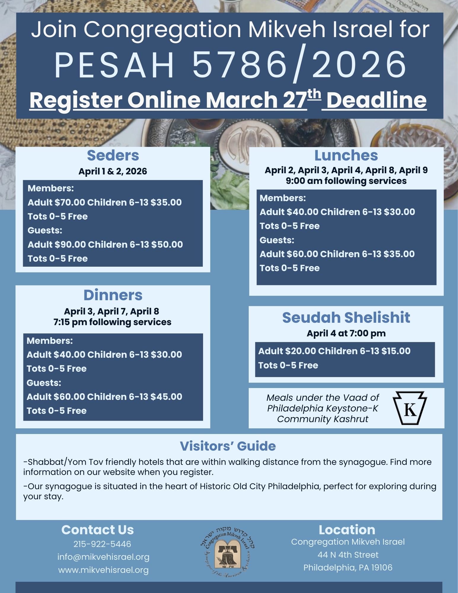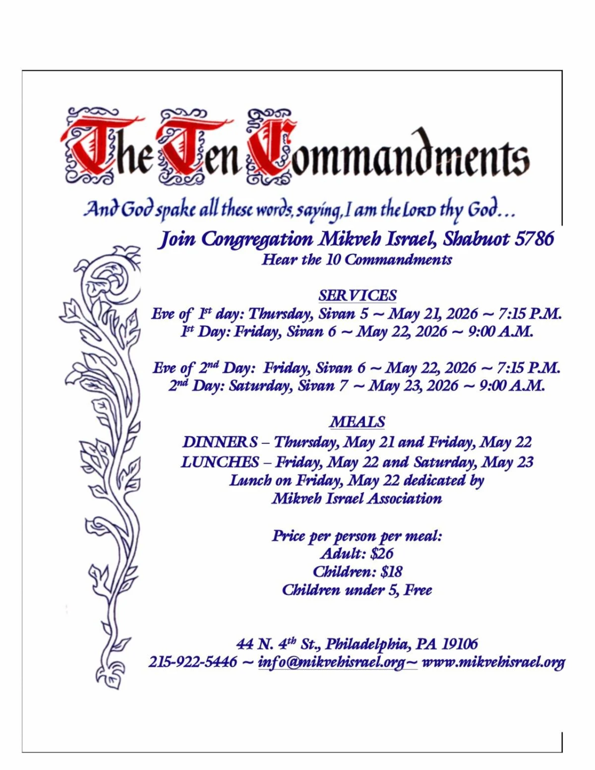 Congregation Mikveh Israel, "The Hope of Israel," was founded in 1740 and is an unparalleled American Jewish Institution. It has a two-fold tradition that is the synthesis of the Spanish-Portuguese Jewish ritual and the ongoing development of the American Jewish community.